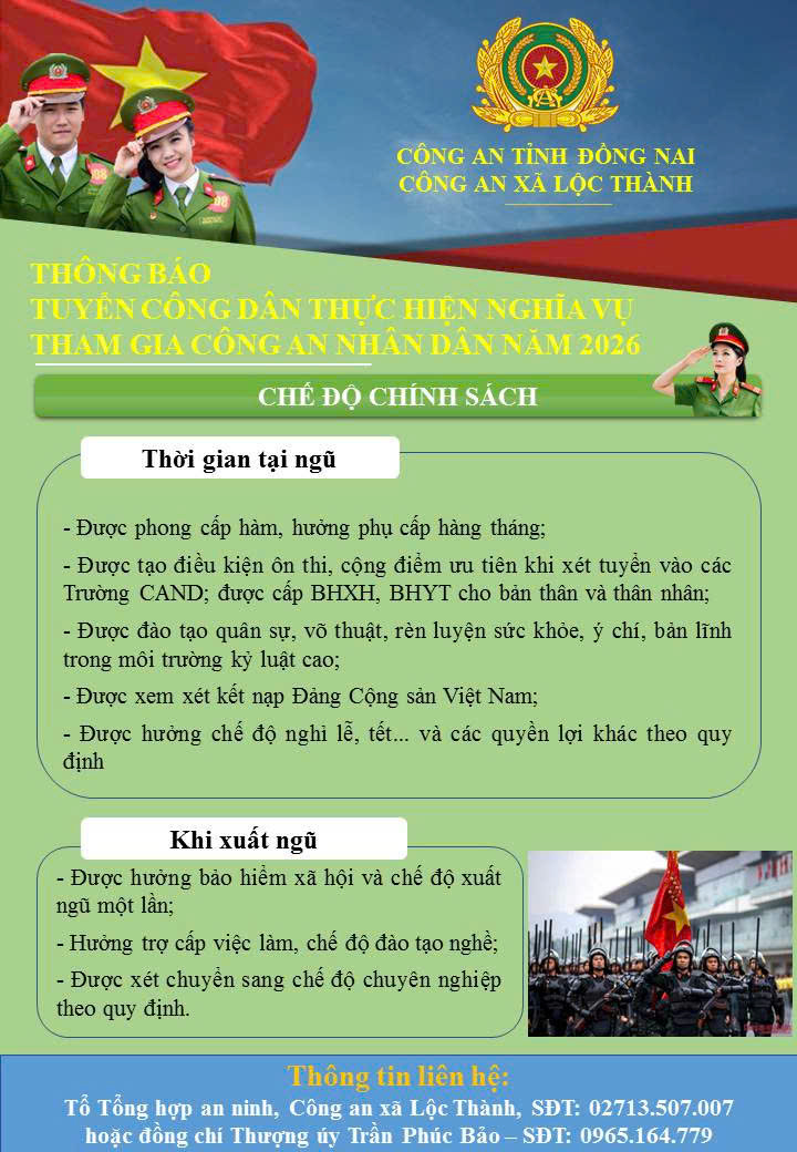 CÔNG AN XÃ LỘC THÀNH THÔNG BÁO CÔNG DÂN THỰC HIỆN NGHĨA VỤ THAM GIA CÔNG AN NHÂN DÂN 2026
