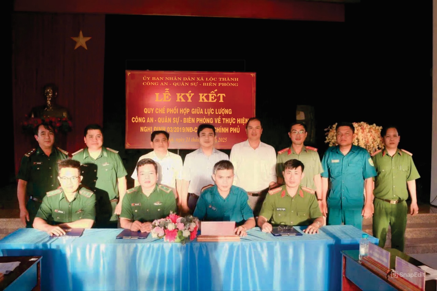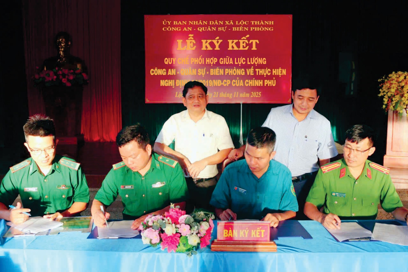 Chiều ngày 21/11/2025, tại trụ sở UBND xã Lộc Thành, UBND xã đã tổ chức Lễ ký kết Quy chế phối hợp giữa lực lượng Công an, Quân sự và Bộ đội Biên phòng trong việc thực hiện Nghị định 03/2019/NĐ-CP ngày 05/9/2019 của Chính phủ về phối hợp giữa Bộ Công an và Bộ Quốc phòng trong thực hiện nhiệm vụ bảo vệ an ninh quốc gia, đảm bảo trật tự an toàn xã hội, đấu tranh phòng chống tội phạm và thực hiện nhiệm vụ quốc phòng, nhằm tăng cường hiệu quả công tác phối hợp giữa các lực lượng trên địa bàn xã.