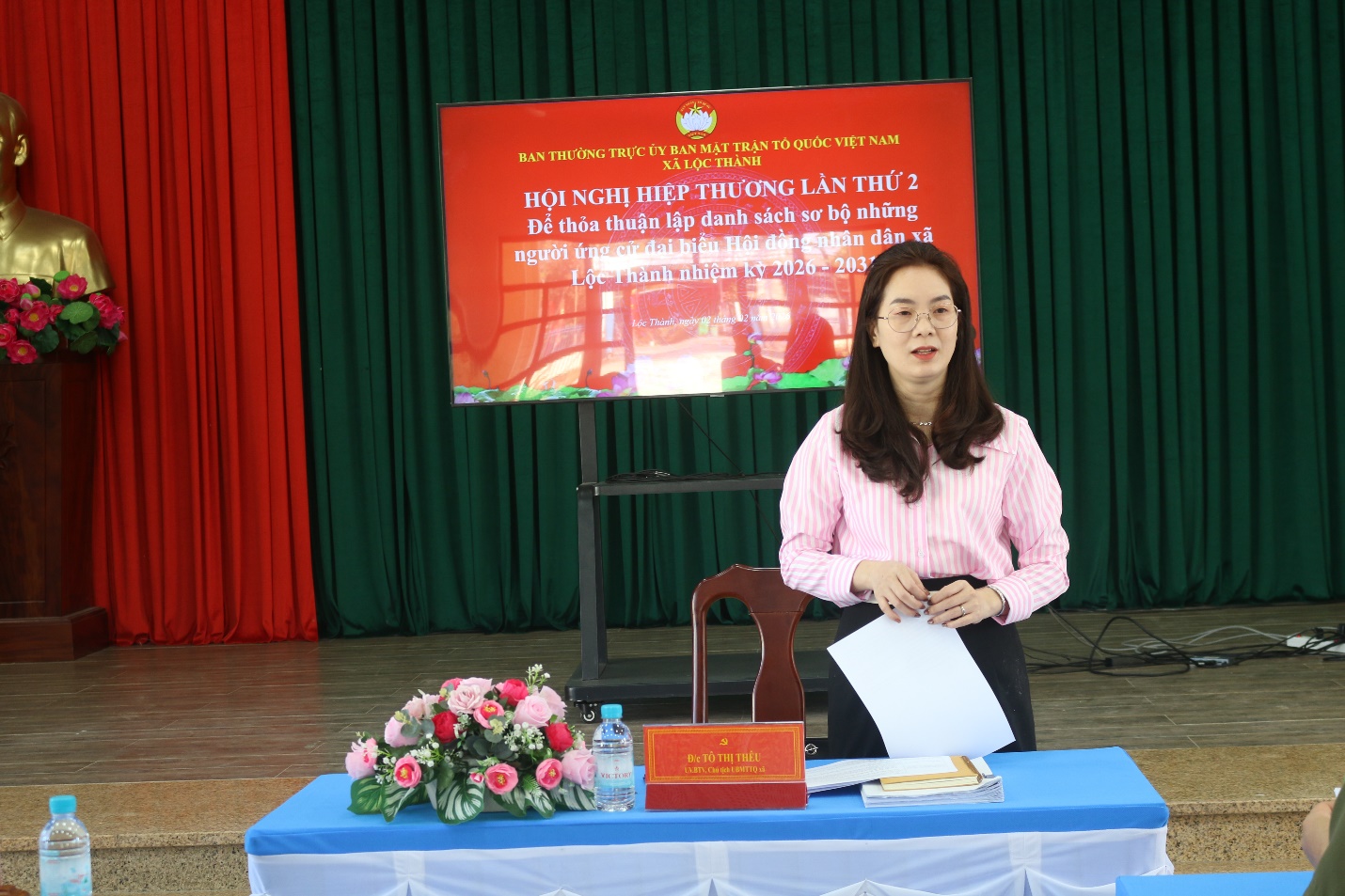 Thực hiện quy định của Luật Bầu cử đại biểu Quốc hội và đại biểu Hội đồng nhân dân; căn cứ kế hoạch hiệp thương của Ủy ban Mặt trận Tổ quốc Việt Nam các cấp, vừa qua, Ủy ban MTTQ Việt Nam xã Lộc Thành đã tổ chức Hội nghị hiệp thương lần thứ hai khóa XIII, nhiệm kỳ 2026 – 2031. Hội nghị do đồng chí Tô Thị Thêu - Ủy viên Ban Thường vụ Đảng ủy, Chủ tịch Ủy ban MTTQ Việt Nam xã Lộc Thành chủ trì.