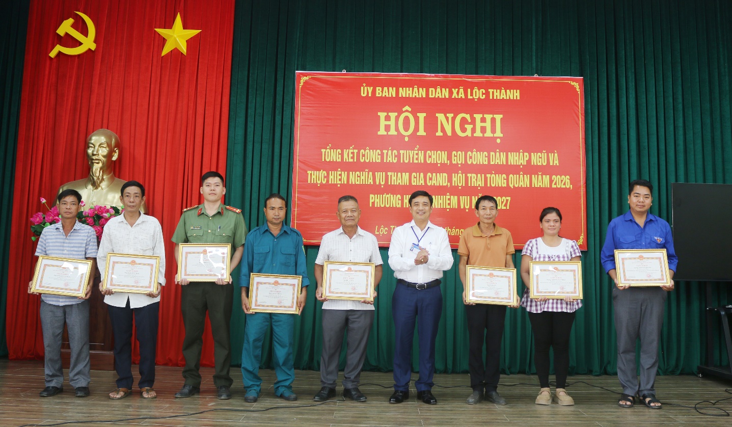 Dịp này, UBND xã Lộc Thành đã khen thưởng cho các tập thể, cá nhân có thành tích xuất sắc trong công tác tuyển chọn, gọi công dân nhập ngũ và tổ chức hội trại tòng quân năm 2026. Hội nghị là dịp quan trọng để đánh giá kết quả, rút ra bài học kinh nghiệm, góp phần nâng cao chất lượng công tác tuyển quân trong những năm tiếp theo.