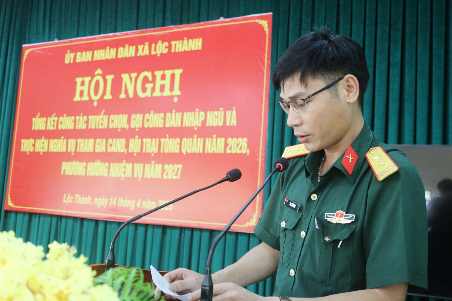 Phát biểu tại hội nghị, Trung tá Mai Xuân Đạt – Phó Tham mưu trưởng Ban Chỉ huy phòng thủ khu vực 4 – Bình Long ghi nhận và đánh giá cao kết quả công tác tuyển quân của xã Lộc Thành trong năm 2026; đồng thời đề nghị địa phương tiếp tục phát huy vai trò lãnh đạo, chỉ đạo, nâng cao chất lượng công tác tuyển chọn, gọi công dân nhập ngũ, đảm bảo chặt chẽ, đúng quy định, góp phần hoàn thành tốt nhiệm vụ quốc phòng, quân sự địa phương trong thời gian tới.