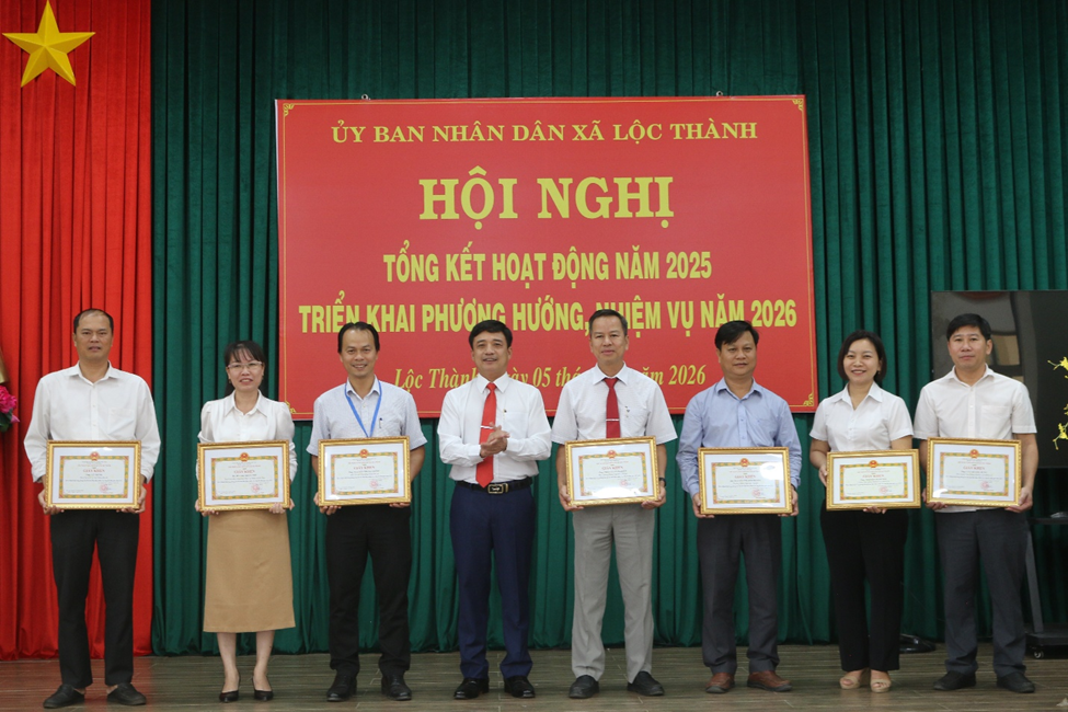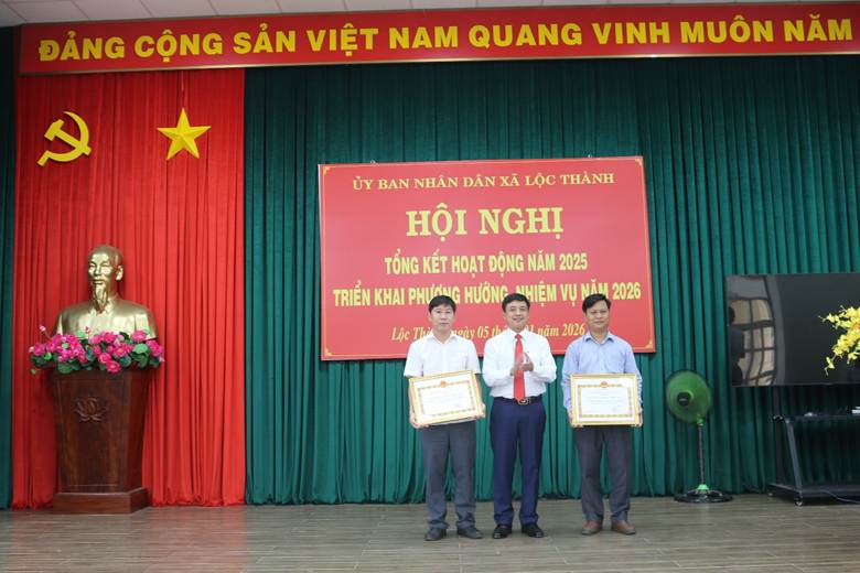 Nhân dịp này, UBND xã Lộc Thành đã tổ chức khen thưởng 02 tập thể đạt danh hiệu Lao động tiên tiến; trao Giấy khen của UBND xã cho 04 tập thể có thành tích tiêu biểu trong thực hiện nhiệm vụ năm 2025; đồng thời tuyên dương 11 cá nhân đạt danh hiệu “Chiến sĩ thi đua cơ sở” và 46 cá nhân hoàn thành tốt nhiệm vụ được giao trong năm 2025.