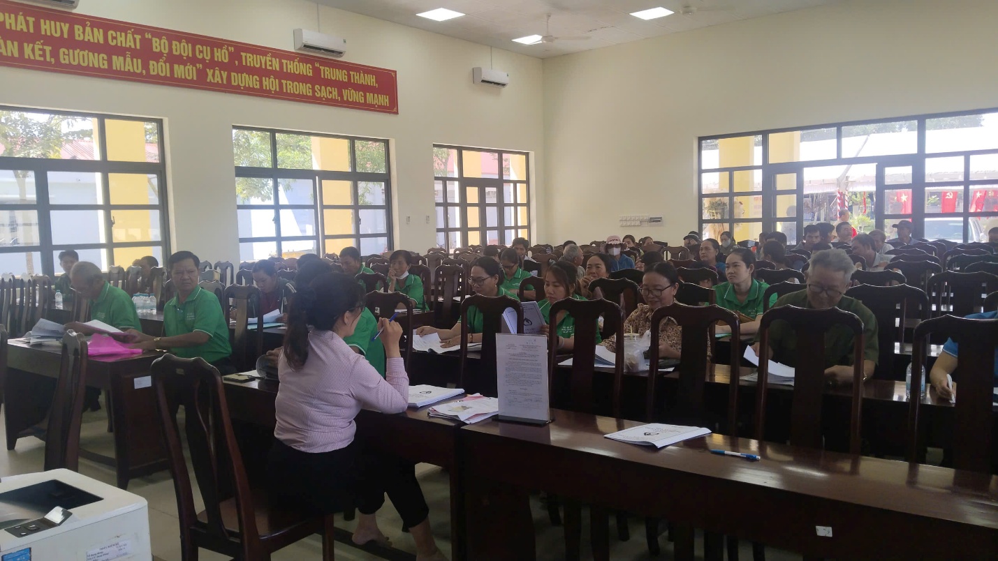Cán bộ NHCS tuyên truyền về việc gửi tiền tiết kiệm tại cuộc họp giao ban với tổ chức hội đoàn thể và tổ TK&VV