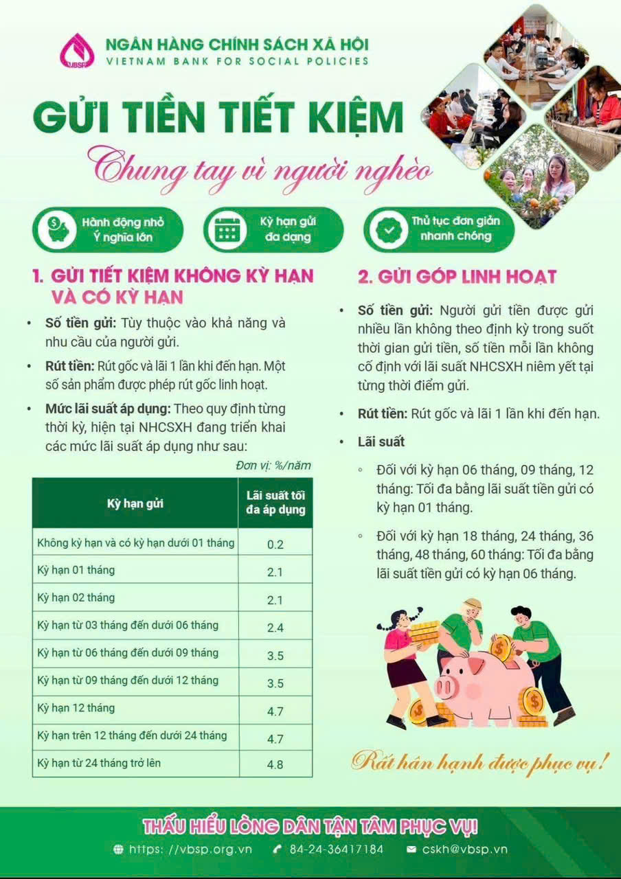 Đặc biệt, mức lãi suất huy động của NHCSXH hiện tương đương lãi suất của các ngân hàng thương mại. Đây là mức lãi suất cạnh tranh, an toàn và phù hợp để người dân lựa chọn gửi tiết kiệm, đồng thời góp phần chung tay cùng Nhà nước thực hiện các chương trình tín dụng chính sách trên địa bàn.