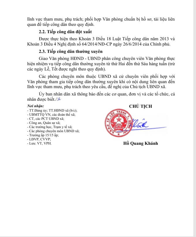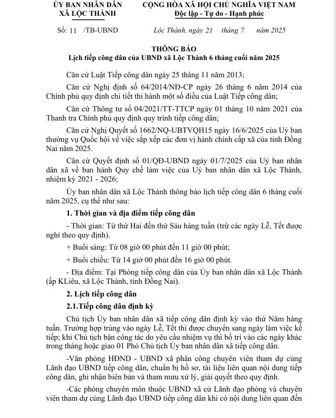 LỊCH TIẾP CÔNG DÂN UBND XÃ LỘC THÀNH 6 THÁNG CUỐI NĂM 2025