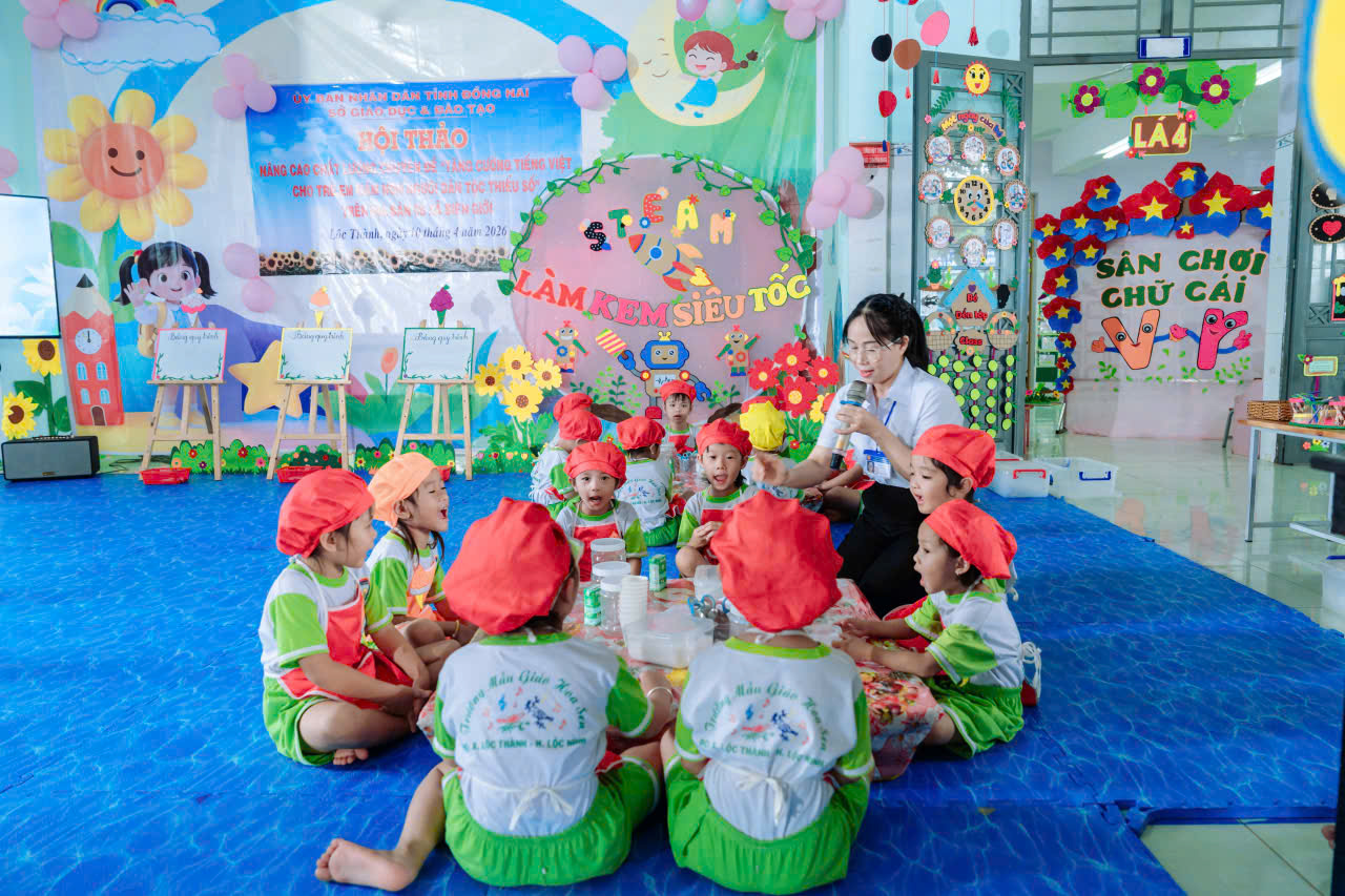Sáng 10/4/2026, tại Trường Mẫu giáo Hoa Sen (ấp K Liêu, xã Lộc Thành, tỉnh Đồng Nai), tổ chức hội thảo với chủ đề “Nâng cao chất lượng chuyên đề tăng cường tiếng Việt cho trẻ mầm non người dân tộc thiểu số trên địa bàn 8 xã biên giới”.