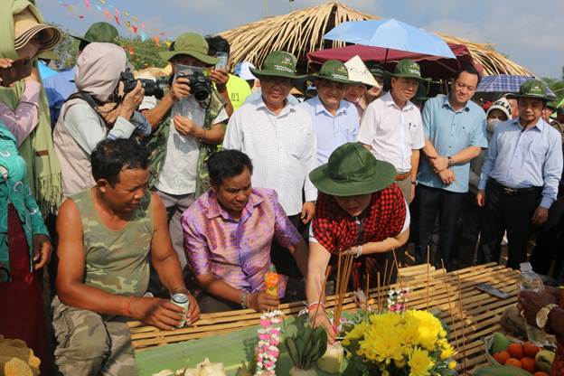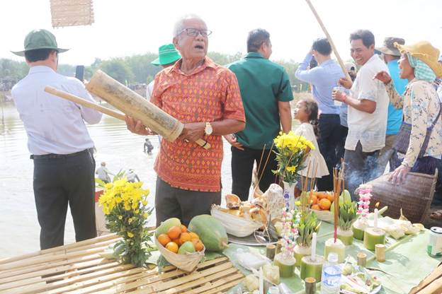 Trước khi bước vào phần hội náo nhiệt, phần quan trọng và thiêng liêng nhất chính là nghi lễ cúng thần Bàu. Già làng – chủ lễ cùng các bậc cao niên trong ấp Kliêu đã tiến hành thực hiện các nghi thức cúng tế truyền thống. Trong làn hương trầm thành kính, Già làng dâng lễ vật và đọc lời khấn nguyện, cầu mong các vị thần linh phù hộ cho mưa thuận gió hòa, mùa màng bội thu, nguồn nước dồi dào và tôm cá đầy bàu để bà con có một mùa đánh bắt may mắn. Nghi thức này thể hiện sâu sắc đạo lý "uống nước nhớ nguồn" và sự tôn trọng của con người đối với thiên nhiên - một nét đẹp nhân văn được lưu truyền qua nhiều thế hệ.