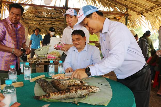 Sau những giờ phút ngâm mình dưới nước và thu hoạch đầy ắp những giỏ cá lóc, cá trê, cá rô... không khí lễ hội càng thêm ấm áp khi mọi người cùng nhau thưởng thức thành quả. Những con cá tươi rói vừa bắt lên được chế biến ngay tại chỗ theo cách mộc mạc nhất: nướng trui trong rơm rạ hoặc nướng trên bếp than hồng rực. Mùi thơm nức của cá nướng hòa quyện với mùi khói đồng quê lan tỏa khắp không gian. Mọi người cùng ngồi lại bên nhau, không phân biệt khách hay chủ, cùng thưởng thức vị ngọt đậm đà của cá tươi chấm với muối ớt cay nồng. Bữa ăn dân dã ngay bên bờ bàu không chỉ là dịp để bà con cải thiện bữa ăn mà còn là khoảnh khắc thắt chặt tình làng nghĩa xóm, cùng sẻ chia niềm vui sau một mùa lao động vất vả.