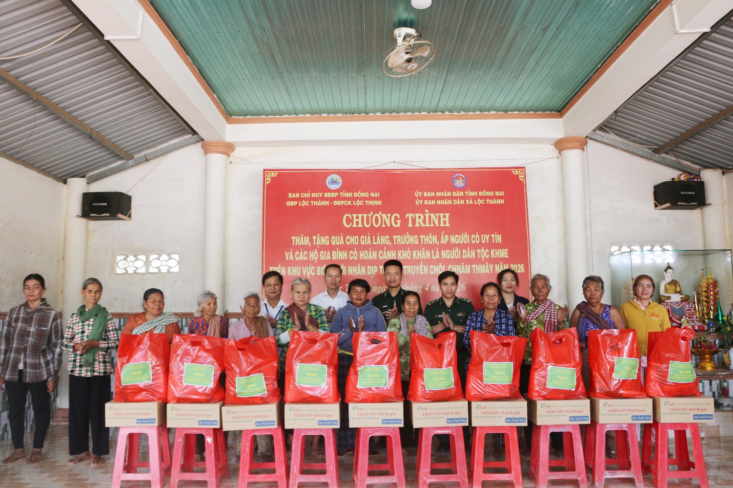 Sáng ngày 13/4/2026, tại Nhà văn hóa ấp K Liêu, xã Lộc Thành, Ban Chỉ huy Bộ đội Biên phòng tỉnh chủ trì, phối hợp với các đơn vị liên quan và chính quyền địa phương tổ chức chương trình thăm, tặng quà cho già làng, trưởng thôn, trưởng ấp, người có uy tín và các hộ gia đình có hoàn cảnh khó khăn là đồng bào dân tộc Khmer trên địa bàn, nhân dịp Tết cổ truyền Chôl Chnăm Thmây năm 2026, góp phần mang đến một mùa Tết ấm áp, nghĩa tình nơi vùng biên.