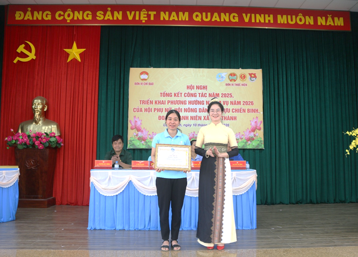 Đồng chí Tô Thị Thêu – UV.BTV Đảng ủy, Chủ tịch Ủy ban MTTQ Việt Nam xã trao bằng khen của Hội Liên hiệp Phụ nữ tỉnh Đồng Nai cho cá nhân có thành tích xuất sắc trong công tác phụ nữ tại xã Lộc Thành