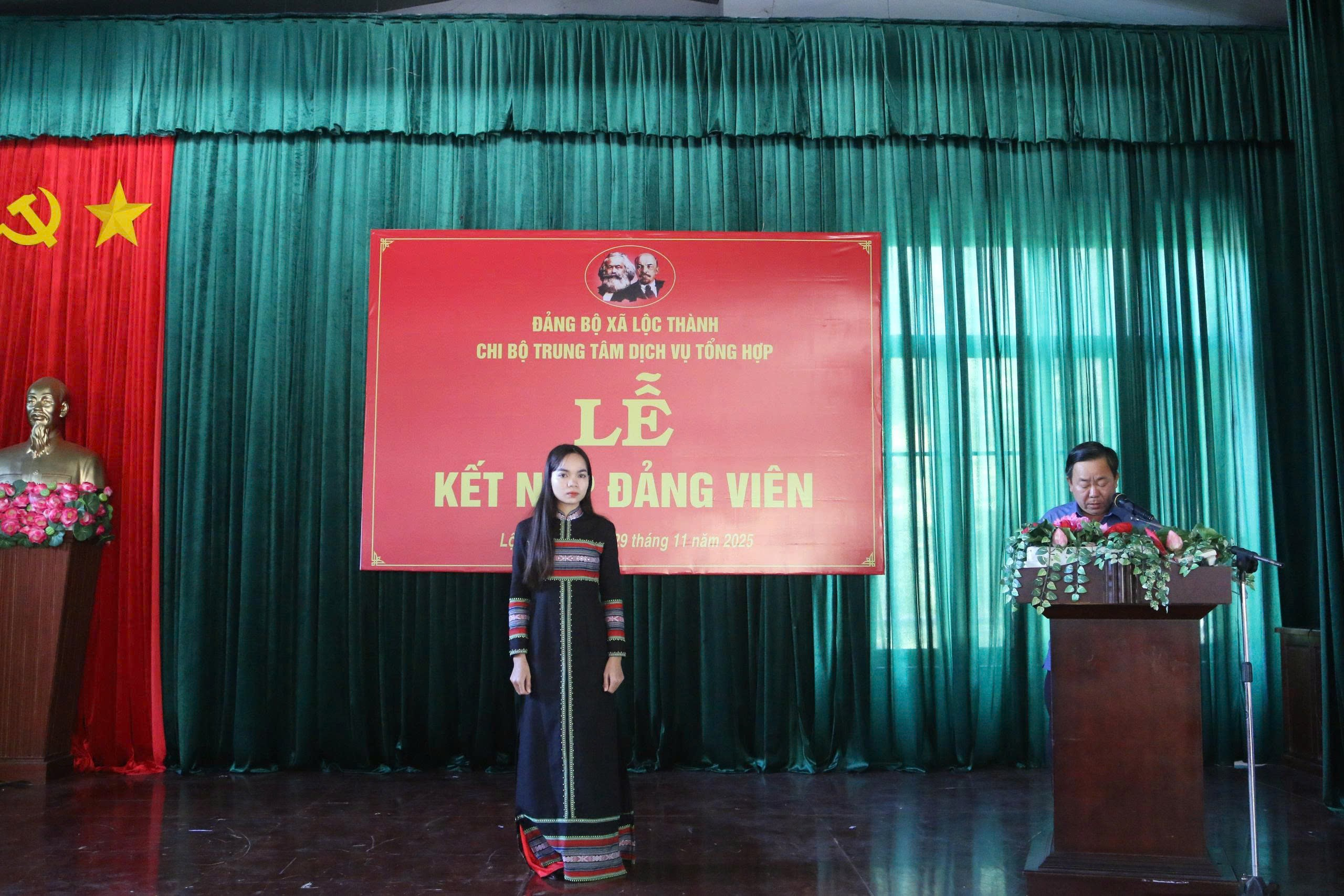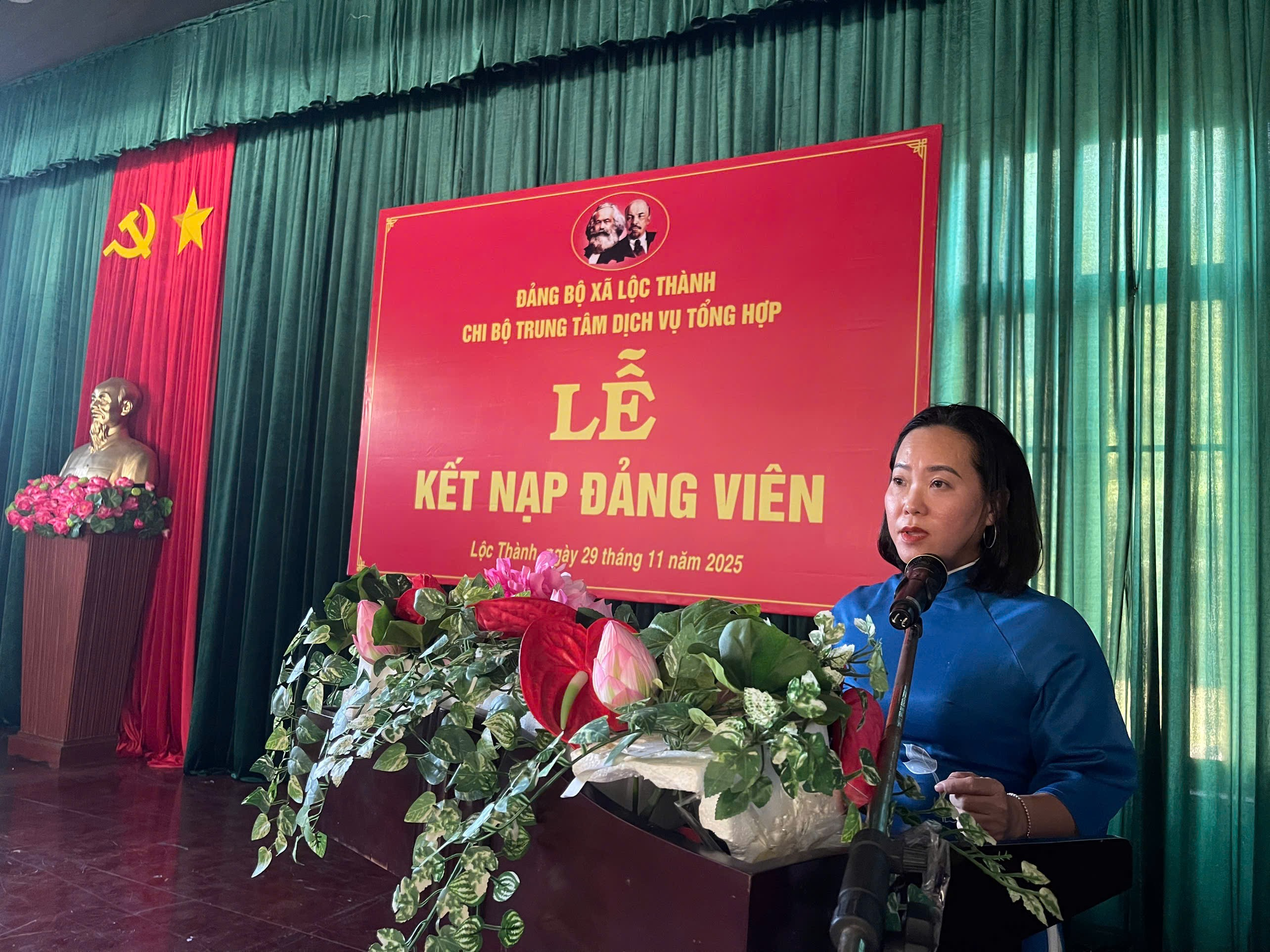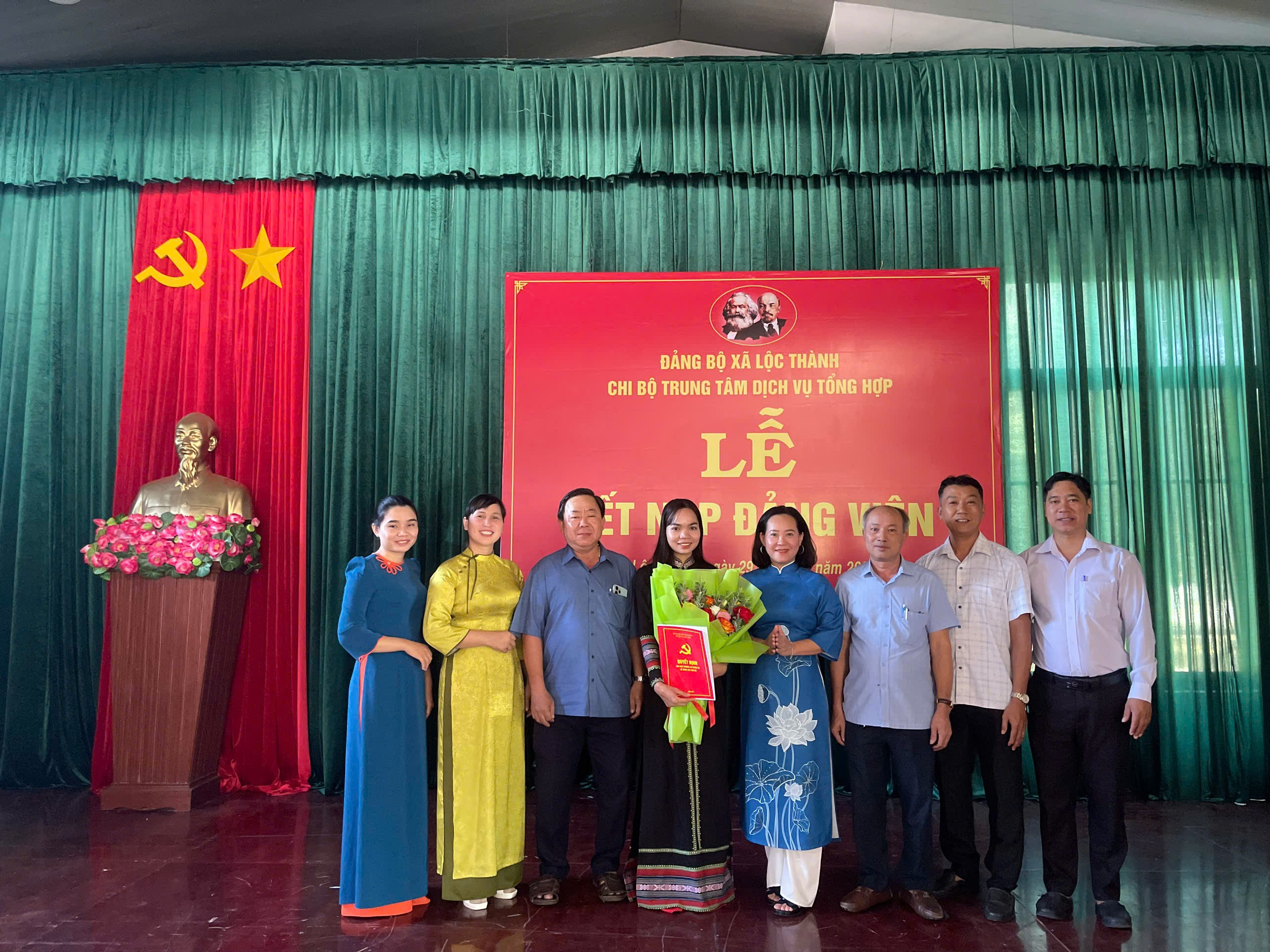 ►Trong cùng ngày, Chi bộ Trung tâm Dịch vụ Tổng hợp xã Lộc Thành cũng tổ chức Lễ kết nạp đảng viên mới cho quần chúng Thị Nin (sinh năm 1995), nhân viên Trung tâm Dịch vụ Tổng hợp xã. Buổi lễ có sự tham dự của đồng chí Nguyễn Thị Kiều Trang – UV.BTV Đảng ủy, Phó Chủ tịch UBND xã; đồng chí Lê Hồng Khanh – UV. BTV Đảng ủy, Trưởng Ban Xây dựng Đảng; đồng chí Trần Thanh Tùng - Bí thư Chi bộ, Giám đốc Trung tâm; cùng toàn thể đảng viên Chi bộ. Đảng viên mới đã trang nghiêm tuyên thệ, thể hiện ý chí kiên định, tuyệt đối trung thành với lý tưởng của Đảng và ý thức trách nhiệm trong thực hiện nhiệm vụ của người đảng viên.